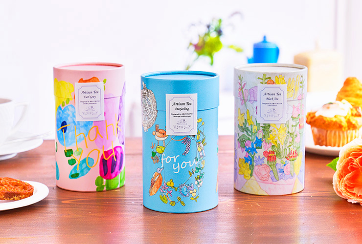 リニューアルされたパッケージには、アールグレイティーは山本 頼子さんの「Thank you」、ダージリンティーは松永 紬さんの「とりたちのリース」、ブラックティーは北野 里佳さんの「花束」のアートワークがデザインされています。